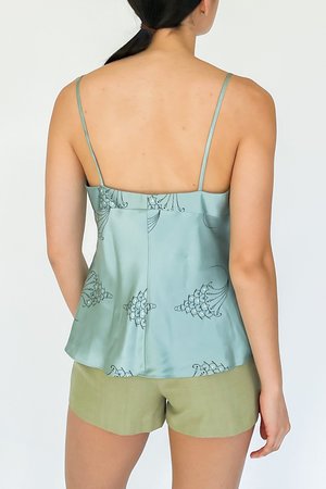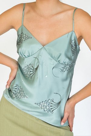 Vintage sea glass satin silk beaded cami. Side zip closure. Relaxed fit. SIZING: Tag: M Fits: S 34" bust 25" length MATERIAL: 100% silk
