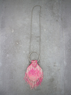 HOH Curate Vintage beaded fringe bag with silver circle handle and top snap closure. White and pink ombre glass beads make this an eye-catching piece. Comes with a long silver chain strap as well to wear on the shoulder. Measures approximately 13" long from top of handle to bottom. Designer: Unknown Color: Pink/White Multi Condition: Pretty good vintage condition. Some minor wear on inner lining which is not noticeable when worn and can be easily fixed.