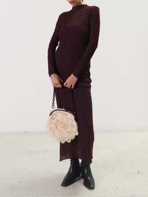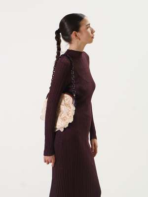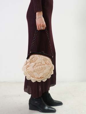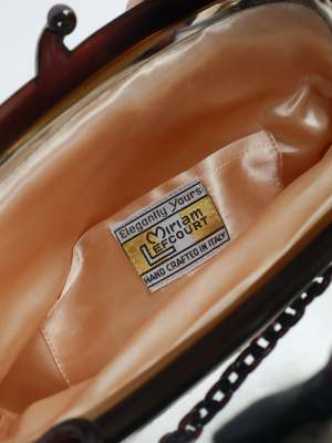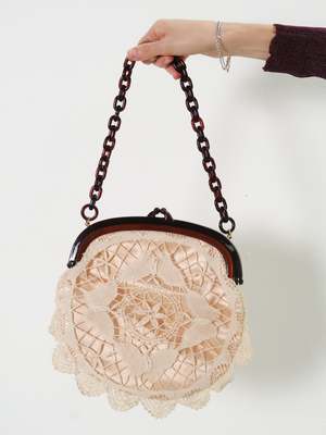A vintage crochet handbag with a mahogany lucite chain link strap. Featuring a delicate butterfly motif, silk lining, and kiss closure.