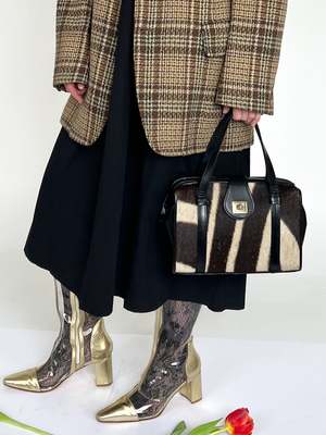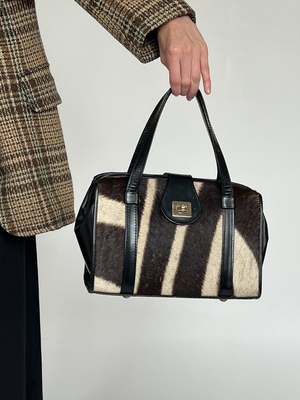 Vintage black leather handbag with suede interior and zebra dyed horsehair on one side. Saddle style closure with a metal detail. MEASUREMENTS (in inches) 8 in strap drop 11 in length 5 in width 6 in depth MATERIALS horsehair, leather