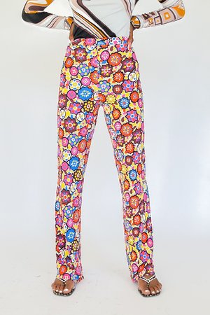Vintage Emilio Pucci abstract flower print pants. Mid rise fit. Stretchy feel. SIZING: Tag: 42 Fits: XS 25" waist 10" rise 32" hip 33" inseam MATERIAL: 83% viscose 17% silk