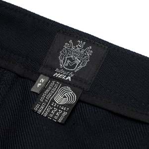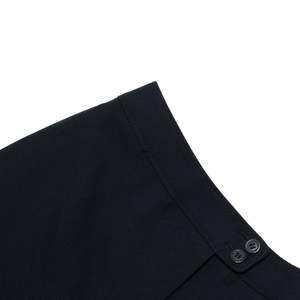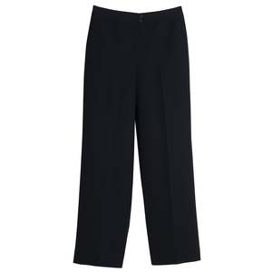 The high-waisted, wide-leg tailored trousers by Hela exemplify the convergence of utilitarian precision and refined sartorial restraint that defined late 20th-century West German womenswear. Constructed with an anatomical waistband and a double-button extension tab, the garment relies on a clean front with no pleats, cuffs, or decorative seaming. The fabric100% Schurwolle (virgin wool)is woven in a steep 2/2 twill, yielding a durable and breathable midweight textile with high crease retention. These trousers represent an exemplar of quiet power dressing, where construction communicates authority through precision and restraint.