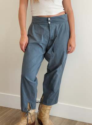Antique Indigo Dyed Bloomers in soft cotton with lace back adjustable tie. Some natural indigo streaks from dye process. Size: extra small-medium based on desired fit. All measurements taken flat: Waist: 15 Rise: 13.5 Thigh: 13 Inseam: 24 Hip: 20 Color: indigo Material: cotton Jess is an extra small. All items are preloved or vintage so might show signs of minor wear. Anything major will be noted & photographed.