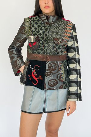 Vintage textile collage print jacket. Zip closure. Front pockets. Fully lined. SIZING: Tag: 42 Fits: M 16" shoulder 38" bust 24.5" length MATERIAL: 80% poly 20% wool
