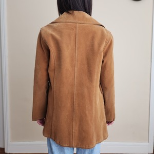 Gorgeous vintage jacket in golden tan. Features wide point collar, snap button closure in front, two front pockets, one chest pocket, waist belt loops, and quilted lining for extra warmth. Made in Japan. Size Tag - 12, best fits S Measurements - chest 37", sleeve 26", length 32" *measurements taken seam to seam while lying flat *doubled for CHEST (BUST), WAIST, HIP Fabric Content - n / a (tag too faded to read) feels like suede Condition - good vintage condition, shows some minor signs of wear throughout but no major flaws. Model - height 5' 3", chest 32", waist 28", hip 36". Size worn is generally a small.