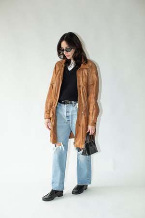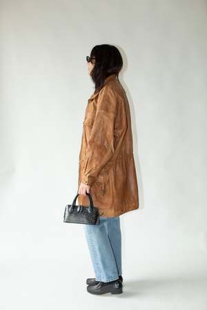 The perfect fall layer. Fits like a modern size M. Relaxed, loose fit. Armpit to armpit: 24.5". Outer Shell: 100% Leather Lining: 50% Acetate, 50% Nylon Note: Buttons need repairing; lining has a few rips. Professional leather clean only.