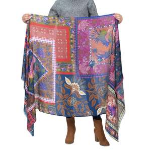 The Songbird Rectangle Wool Scarf in Blue Red offers a vibrant, artistic accent. This oblong scarf features a patchwork print of tropical flowers and birds, rendered in bold colors. The design is printed on 100% wool twill, providing a soft feel and moderate warmth. Its generous size allows for versatile styling, whether worn as a wrap or draped over outerwear. The scarf measures 38" x 74". Crafted from 100% wool twill for a soft feel and lasting wear. Generous 38" x 74" dimensions offer multiple styling options. Intricate patchwork print adds a detailed visual element to any ensemble. Designed in Los Angeles, reflecting a contemporary aesthetic. Made in India.