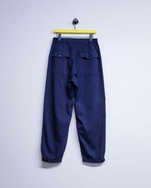 The Visvim Carrol Pants draw inspiration from vintage racing trousers, offering a versatile, laid-back silhouette. A high rise and relaxed top block taper to buttoned hems that adjust for either a streamlined or casual look. The partially elasticated waistband ensures all-day comfort, while long-staple cotton chino cloth offers both softness and structure. Finished with a one wash treatment for a lived-in feel and detailed with custom buttons, a brass zipper, and practical pockets, they deliver refined utility for everyday wear.