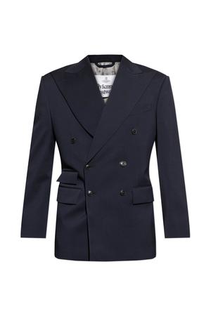 Men > Clothing > Coats & Jackets > Blazers Experience the essence of refined tailoring with this Double-Breasted Blazer by Vivienne Westwood. Crafted from luxurious pure wool, the piece has a sophisticated minimalist look, defined by its smooth-textured fabric and absence of distracting patterns. The sharply contoured silhouette features pronounced broad shoulders and classic lapels. Six buttons secure the double-breasted front, complemented by two flap-covered pockets and a chest welt pocket. Subtle topstitched accents complete the design. Composition: 100% Wool.