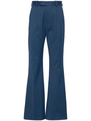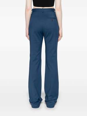 Women > Clothing > Pants & Shorts > Pants Navy blue stretch-design tailored design with belt loops, pleat detailing, high-waisted fit, concealed front button, hook and zip fastening, slight flare, two side slit pockets, and a rear button-fastening jetted pocket. Composition: Lining: 100% Cotton; Outer: 44% Polyamide, 7% Elastane.