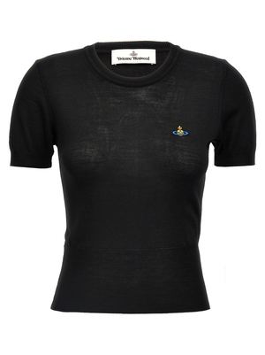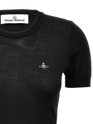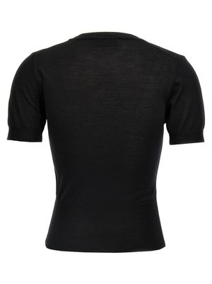 Women > Clothing > Topwear 'Bea' silk-blend knit top with crew neck, front logo2 embroidery detail, and short sleeves. Composition: 70% wool, 30% silk.