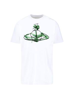 Vivienne Westwood 'Classic' white cotton crew neck t-shirt with short sleeves, green and black 'Drawn Orb' logo2 print on the chest, straight hem. Composition: 100% Cotton