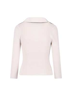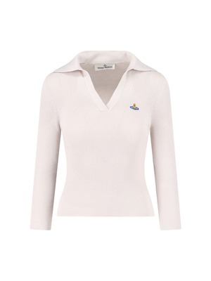Vivienne Westwood 'Marina' polo shirt in cream cotton and cashmere with ribbed pattern, V-neck, long sleeves, multicolor 'Orb' logo2 embroidery on the chest, and straight hem. Composition: 85% Cotton, 15% Cashmere.