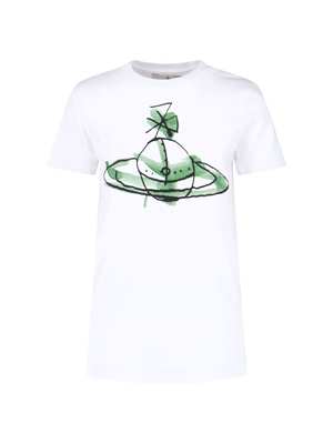 Vivienne Westwood 'Classic' white cotton crew neck t-shirt with short sleeves, featuring a green and black 'Drawn Orb' logo2 print on the chest and a straight hem. Composition: 100% Cotton.