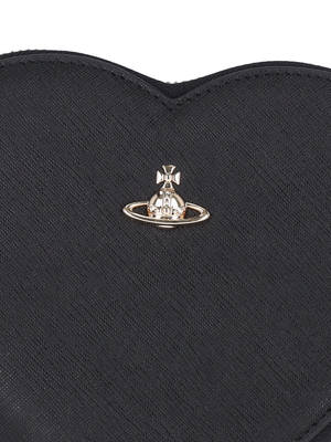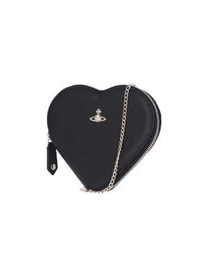 Women > Bags > Shoulder Bags Vivienne Westwood 'New Heart' crossbody bag in black faux leather with silver-tone metal details, tone-on-tone Saffiano leather trim, heart design, chain shoulder strap, embossed Orb logo2 on the front, zip closure with zip puller, and a single inner compartment. Composition: 16% polycotton, 30% repolycotton, 54% polyurethane.