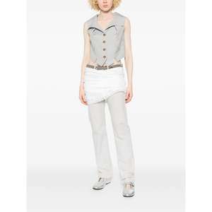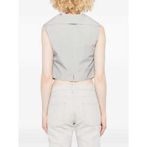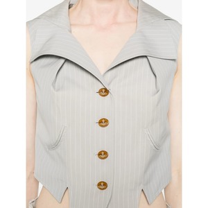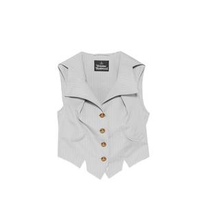 Women > Clothing > Coats & Jackets > Vests Light grey pinstripe pattern waistcoat with button fastening, sleeveless construction, and front pockets.