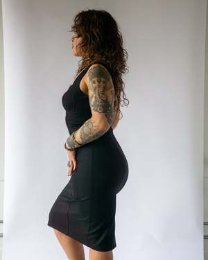 Inspired by the worlds first known sculpture of a womanVenus of Hohle Fels. This dress is designed to sculpt your body and snatch your waist, all without a bra. Crafted from premium ponte fabric, it delivers sleek style without zippers or buttons. Features: - Premium ponte fabric: smooth, stretchy, and supportive - Under-bust support and nip coverage: seam placement for lift and confidenceno bra required - Snatched waist effect: seams that define your shape - Slip-on ease: no zippers, no buttons, no hassle - Versatile wear: lounge, work, or go out in style