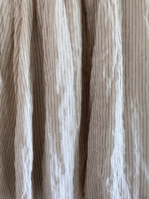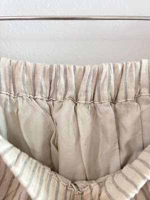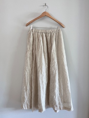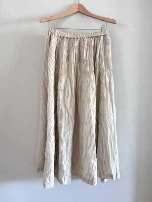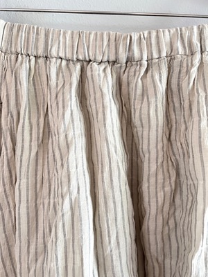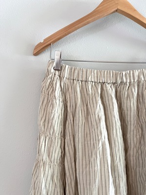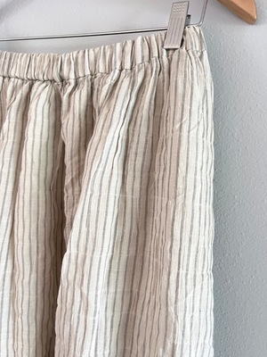 Striped Skirt by Vlas Blomme Size F (One Size) Vlas Blomme, Flemish for flax flower, takes its name from the region of its linen, known for its softness and quality. Created by Japanese designer Yoriko Sakurama, Vlas Blomme is a marriage of her passion for antiques and gardening. Gorgeous beige striped skirt with inner lightweight layer made of cupra and an elastic/stretchable waist Materials: 94% of cotton, linen 5%, polyurethane 1% Lining - cupra 100% Estimated measurements (laid flat) [Waist] approx 12.6 in, stretched up to 3 in [Length] approx 34.25 in