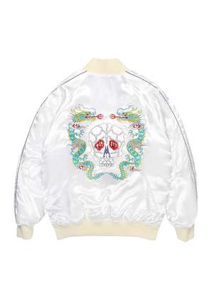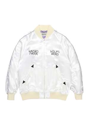 A souvenir "ska" jacket made from 100% rayon with a glossy finish. All of the designs on the chest and back are fully embroidered. Color: White Material: 100% Rayon Size: L: Length 69 cm, Width 66 cm, Shoulder 56 cm, Sleeve 60 cm XL: Length 71 cm, Width 68 cm, Shoulder 58 cm, Sleeve 61.5 cm
