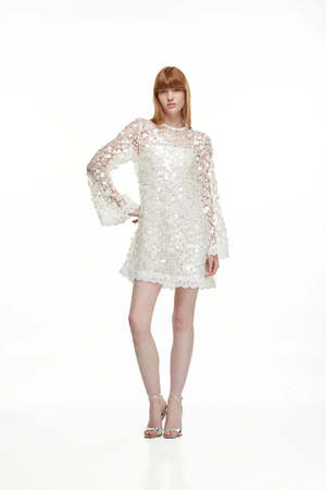 The Eclipse Mini Dress, crafted from 100% polyester, shines with its own magic, capturing the light and transforming it into a halo of sophistication. Its loose, lightweight silhouette gently wraps the body, while an exquisite arrangement of circular appliqus creates a hypnotic play of textures and reflections, adorning both the front and the softly draping long sleeves. Perfect for seaside celebrations or sunset cocktails, this dress is ideal to pair with delicate sandals or subtle jewelry, leaving a luminous and unforgettable impression.