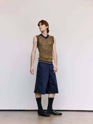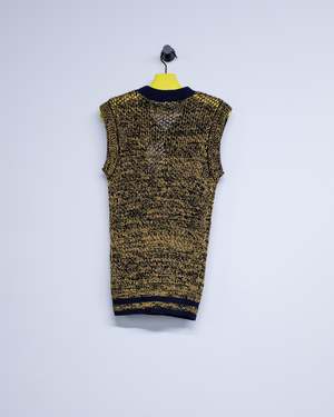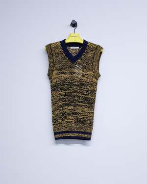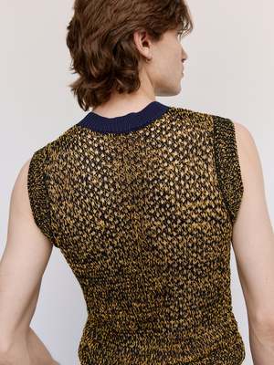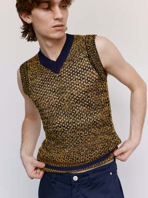 Lightweight Mouline yarn knit vest. Features a slim cut, V-neck, and ribbings at the hems. Cotton viscose blend.