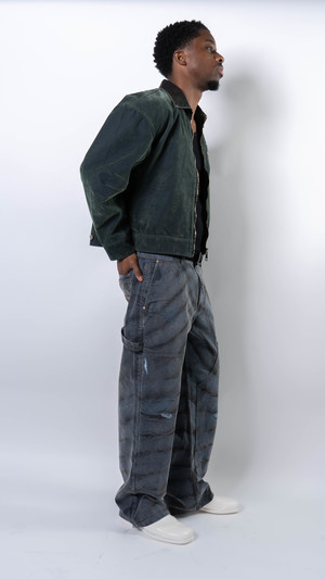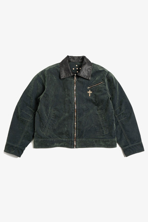 Constructed entirely from green flocked denim with a PU leather collar. The garment is washed for a naturally aged effect. Features the brands signature custom-designed multi-color sawtooth zipper. A distressed logo2 print on the chest and a studded cross emblem on the back reinforce the brand identity. Cropped silhouette. Body: 100% cotton Collar: PU leather Made in China Sizing - Regular fit - Model is 6' / 145 lbs, wearing size M. Size (cm) S: 1/2 Chest 60, Shoulder 56, Sleeve 55, Length 62 M: 1/2 Chest 64, Shoulder 60, Sleeve 58, Length 66 L: 1/2 Chest 68, Shoulder 64, Sleeve 61, Length 70 *Measurements are in cm. Manual measurement may result in a 12 cm margin of error.