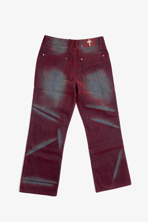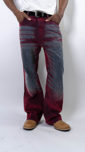 Crafted from signature flocked denim and treated with a Nevada wash that reveals hints of the original blue base beneath the red surface, creating a striking layered effect with exceptional sheen. 3D embroidered logo2 at the lower leg. Distressed, raw-cut hem. Finished with burgundy satin pocket lining, oxidized custom hardware, and a signature rainbow zipper. Slight bootcut silhouette that elongates the legs and enhances proportion. Pairs effortlessly with everything from statement boots to a clean pair of all-white Air Force 1s. 100% Cotton Made in China Sizing Runs small. We suggest going one size up from your usual size. Model is 5'11" / 154 lbs, wearing size L. Measurements (in cm; manual measurement may result in a 12 cm margin of error): S: 1/2 Waist 38, Outseam 107, Inseam 74, Leg opening 26 M: 1/2 Waist 41, Outseam 109, Inseam 75, Leg opening 26.5 L: 1/2 Waist 43, Outseam 111, Inseam 76, Leg opening 27