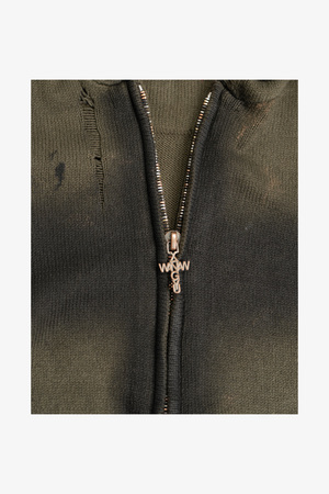 SS25 knit zip hoodie in a washed dark green tone with subtle yellow undertones. Features a black spray-dyed cross graphic at the front as a key brand identifier. Knit-in distressing enhances vintage character and surface texture. Finished with a signature multi-color sawtooth zipper. Relaxed fit. 100% Cotton Made in China. Sizing - Relaxed fit. - Model is 5'11" / 154 lbs, wearing size M. Measurements (in cm) Size S - 1/2 Chest: 58 - Shoulder: 58 - Sleeve: 59 - Length: 64 Size M - 1/2 Chest: 60 - Shoulder: 59 - Sleeve: 60 - Length: 65 Size L - 1/2 Chest: 62 - Shoulder: 60 - Sleeve: 61 - Length: 66 *Manual measurement may result in a 12 cm margin of error.
