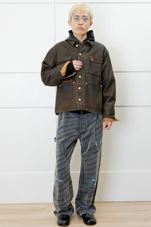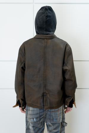 A classic Michigan jacket silhouette reinterpreted with a rich brown exterior and yellow-washed canvas base. The interior is lined with a warm leopard-pattern fleece, offering insulation and comfort for fall and winter wear. The outer surface features a black PU-coated finish, enhancing texture and durability. Custom branded tack buttons and a signature multi-color tooth zipper complete the piece with distinct character. Composition: Shell: 75% Cotton, 25% Lyocell Lining: 5% Wool, 95% Polyester Made in China. Sizing: Model is 59 and 125 lbs, wearing size M. Measurements (in cm): Size M: 1/2 Chest 57, Shoulder 49, Sleeve 63, Length 65 Size L: 1/2 Chest 60, Shoulder 52, Sleeve 65, Length 67 Size XL: 1/2 Chest 63, Shoulder 55, Sleeve 67, Length 69.