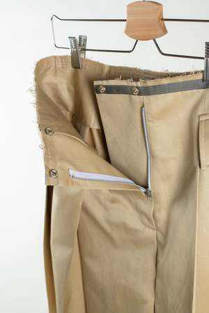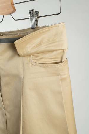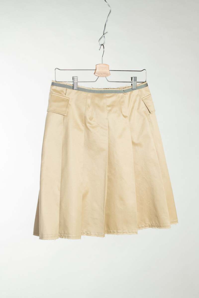 A take on the classic pleated skirt, this piece has an A-line silhouette that sits on the low waist. Pleats throughout the waist taper down to the hem to create a flared shape. Flap pockets adorn the sides while a zipper fly closure completes the front. The front seam is left unsewn towards the hem, allowing for ease of movement. Grey grosgrain ribbon finishes the waist and hem, left raw to age with wear. Designed and sewn in Toronto. Material: 70% cotton, 30% silk. Made in a fine Italian cotton silk, this fabric maintains structure and has a slight sheen for a sleek appearance and luxe feel. About the designer Wanze Song is a Chinese-Canadian designer based in Toronto, Canada. Wanze focuses on innovative patterning and considered functionality to create compelling garments for the everyday. All pieces are meticulously developed from deadstock fabric sourced from Japan and Italy, and sampled in-house. While grounded in the tenets of classic tailoring, Wanze revisits traditional staples, modifying them with a delicate touch and a contemporary sensibility.