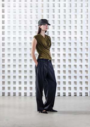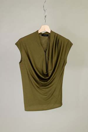 Developed through draping, this jersey top offers a contoured fit. Featuring a cowl neck, the front zipper can be undone, allowing the top to drape off the shoulders. The shoulder extends to a cap sleeve, while asymmetrical seams wrap around the front, creating flow throughout the piece. Made in a soft merino wool, this fabric is lightweight with a luxe feel. The olive shade adds a subtle pop of colour, making this top an elegant addition to any wardrobe. 100% Merino Wool Designed and made in Toronto.