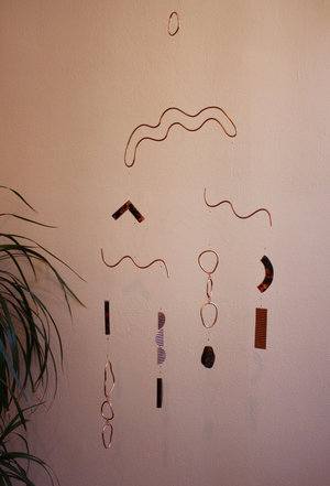 One of a kind wall hanging/mobile made from handcut and formed shapes in copper and repurposed tortoiseshell acetate. 12" wide x 41" long