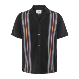 The Ivy shirt is a contemporary spin on the preppy classic. Cut for a relaxed fit from 100% knitted cotton, this button-through polo features a multicolour textured stripe design against a deep black base. Finished with a revere collar, it nods subtly to the charm of 50s bowling shirts. - Reverse stripe knit design for extra texture - Revere collar - Button placket