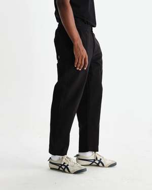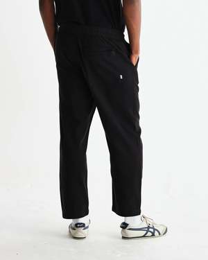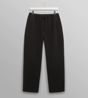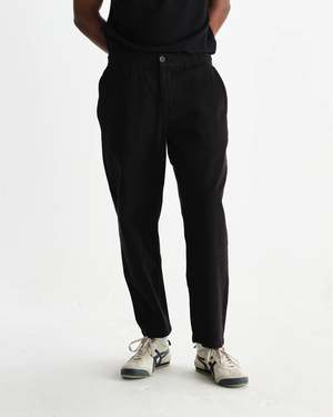 The Kurt Trouser by Wax London is constructed from 100% organic cotton twill in black. Designed with a relaxed fit, tapered leg, and slightly cropped length, it features an elasticated drawstring waist for comfort, button fastening, and a concealed front zip fly. Additional details include two side pockets and one back pocket. Made using a lower-impact garment-dyeing process.