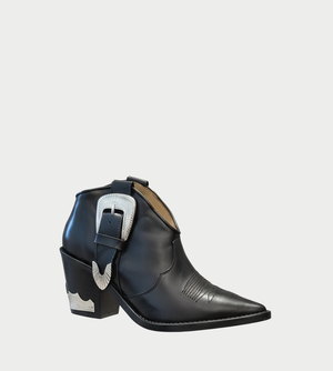 Signature Toga Pulla ankle bootie with "Western" detail buckles and straps. Colour: Black Upper: 100% Leather Lining: 100% Calf leather Outsole: 100% Rubber Made in Portugal. Description tag Signature Toga Pulla ankle bootie with "Western" detail buckles and straps. Meta keywords toga, toga pulla, boot, ankle, heel, bootie, western, cowboy, leather, fashion,