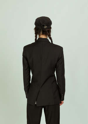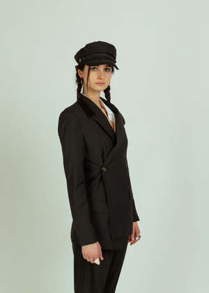 Wear Cissa and Smythe joined forces to combine the wrap shirt and perfect blazer. Jacket can be buttoned traditionally or wrap buttoned and features padded shoulders and suiting details. Details - Classic blazer styling. - Padded shoulders. - Long sleeves. - Optional side buttons for wrapped look. - Dry clean. - Made in Canada. Color carbon. 100% wool. Lining: Lightweight Egyptian cotton.