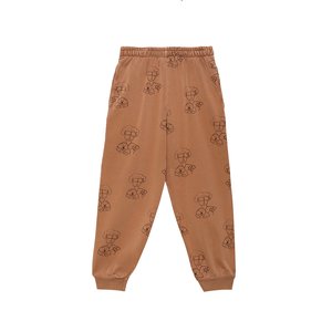Relaxed fit jogger pant in a faded brick organic cotton. Printed with a whimsical rendition of Peggy Guggenheim and her dog, Sir Herbert. - Unisex kid's pant - 96% organic cotton 4% elastane - Color: Brick - Elastic waistband - Side pockets - Ribbed cuffs - Pigment dyed for a unique finish