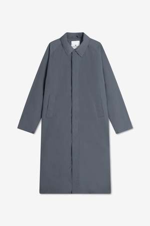 The Long Coach Crincle Nylon by Welter Shelter is a longer lightweight coat in a grey blue color, featuring a generous stormflap at the back and a sporty raglan construction for comfortable movement. Insulated with recycled polyester and built for wet, windy conditions, the Long Coach is fully waterproof, windproof, and breathable, with a 10,000 mm water column. It is finished with taped seams and a PFC-free DWR coating. A minimalist press-button placket and a patented double-zip system provide easy closure and everyday practicality.