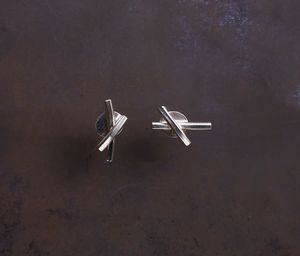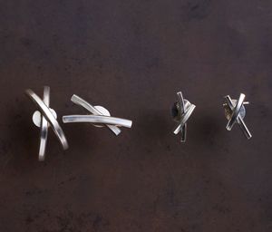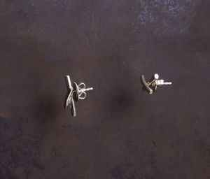 The studded earrings in "Embrace" from Werkstatt Munchen. For these studs, silver wires cross, leaving the ends overlapped. The form is an interpretation of crossing arms during a passionate embrace. The left and right piece should be worn as pictured. On the back, the studs are fastened with a sterling silver butterfly closure. Material: Sterling silver 925/000 Dimensions: Length approx. 11 mm and 16 mm Sold as a pair. Handmade with vintage tools in Munich, Germany.