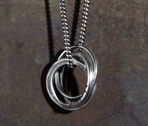 The Forever Necklace in silver from Werkstatt Munchen features a long, fine chain holding three entwined rings. The first ring features parts of lyrics, the second shows fragmentary imprints of words on the side, and the third round ring is inscribed with the name-giving word FOREVER. Material: Sterling silver 925/000 Dimensions: Chain length: approximately 72 cm Ring diameter: approximately 22 mm Handmade with vintage tools in Munich, Germany.