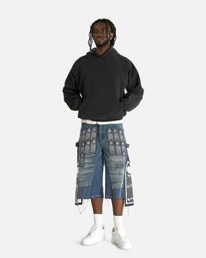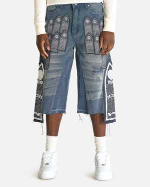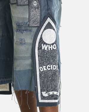 These men's shorts are crafted from a heavyweight cotton canvas fabric and feature a zip fly and button closure, 5-pocket styling, carpenter loops at the sides, patch pockets at the outseams, and embroidered patchwork appliqus on the front, back, and sides that extend past the raw-cut hem. Distressed details and a vintage wash complete the look. Product SKU: 11209-00010-SS25 Model measurements: - Oversized fit, below-knee length - Model is 6' with a 30" waist and wears size [information not provided] Product features: - Belt loops - Zip fly and button closure - 5-pocket styling - Carpenter loops at sides - Patch pockets at outseams - Embroidered patchwork appliqus on front and back - Exaggerated embroidered appliqus on sides - Raw-cut hem - Distressed details - Vintage wash detail Product composition: - 100% cotton - Imported