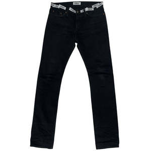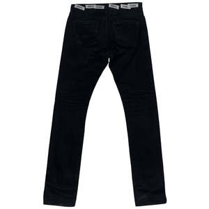 100% black raw cotton denim skinny jeans. Up-cycled and tailored for a skinny fit with hand-sewn brand labels at the waist. This is a unique, one-of-one piece. Machine wash cold and hang dry. Unisex item. Measurements: - Waist: 32 inches - Inseam: 35 inches - Thigh width: 9.5 inches - Calf width: 7.75 inches - Ankle opening: 7.14 inches