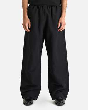 Willy Chavarria Ruff Rider Track Pants in Black. These pants are crafted from a crisp nylon fabric and feature an elasticated waist, 3-pocket styling, and an embroidered logo2 at the hip. Regular fit, straight cut. Model is 6' with a 30" waist and wears size medium.