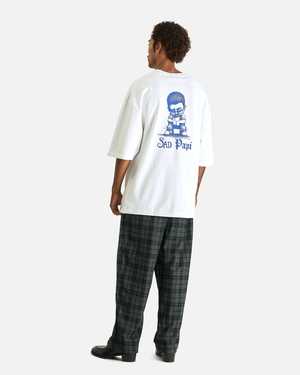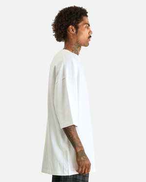 This shirt is crafted from a soft, medium weight cotton jersey and features a ribbed crewneck, dropped shoulder seams, screen printed graphics on the chest and backside, and lengthy short sleeves. Product SKU: WCJSY0124-000 Features: - Ribbed crewneck - Dropped shoulder seams - Screen printed graphics at chest and back - Lengthy short sleeves - Straight hem - Vintage wash Model is 6'2" and wears size medium. 100% cotton. Made in USA.