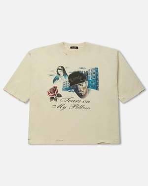 The Tears On My Pillow Northsider Tee by WILLY CHAVARRIA offers an oversized fit crafted from soft, breathable cotton for everyday comfort. Finished with intentional distressing at the collar, sleeves, and hem, it features a vintage-style graphic at the front combining illustrated imagery and script lettering for a worn-in, emotional feel. Its relaxed silhouette and expressive design make it a versatile statement piece for everyday wear. 100% Cotton. Type: Shirts