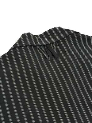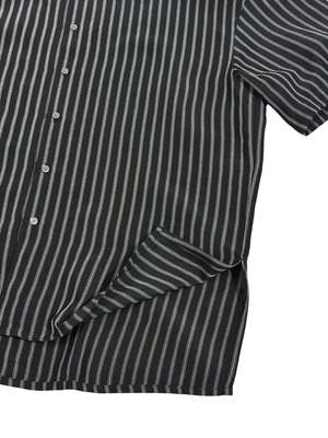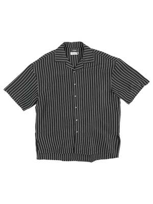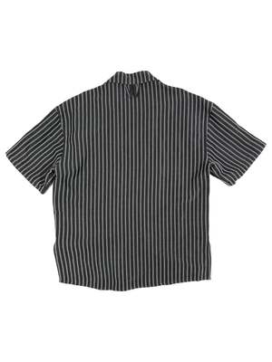 The Camp Collar Shirt in black and white stripe by WILLY CHAVARRIA. The Camp Collar short sleeve shirt is designed with an oversized fit and relaxed proportions, featuring a classic camp collar and dropped shoulders. A vertical pinstripe pattern, clean front button placket with faux mother-of-pearl branded buttons, and a straight hem define the silhouette, while the signature "W" loop at the back adds a subtle, considered finish. 52% Linen, 48% Viscose.