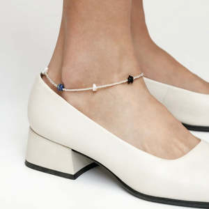 9" anklet featuring glass seed beads, natural stones and freshwater pearls 925 sterling silver lobster clasp Pearls may vary in shape and size Made in Vancouver