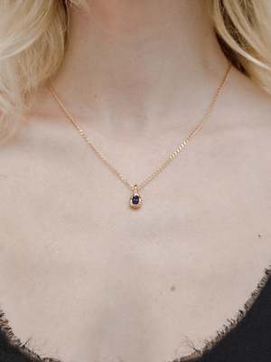 Textured pendant necklace featuring a genuine blue iolite gemstone. Silver: Recycled 925 sterling silver with a 925 sterling silver elongated curb chain. Gold: 14k gold plated recycled brass with a 14k gold vermeil elongated curb chain. Chain measures 18" in length. Each piece of jewelry is designed and handcrafted in Vancouver, Canada.
