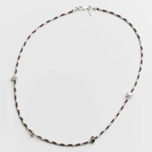 Wolf Circus - June Necklace in Purple. Seed bead necklace Multi-coloured seed beads, white freshwater pearls, silver plated brass and natural stone chips 925 Sterling silver clasp Pearls and stones may vary in shape and size Available in 17.5" and 19" *19" beaded necklaces are Made to Order and will be prepared by our Small Team within one week from original order date. Each piece of jewelry is designed and handcrafted by our talented team in Vancouver, Canada.