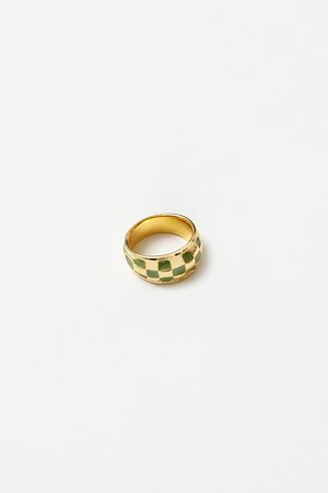Wolf Circus Clara checkered ring in green and gold. 14k gold-plated bronze ring with cream resin. 12mm at widest point Made with recycled metals. PIPE AND ROW